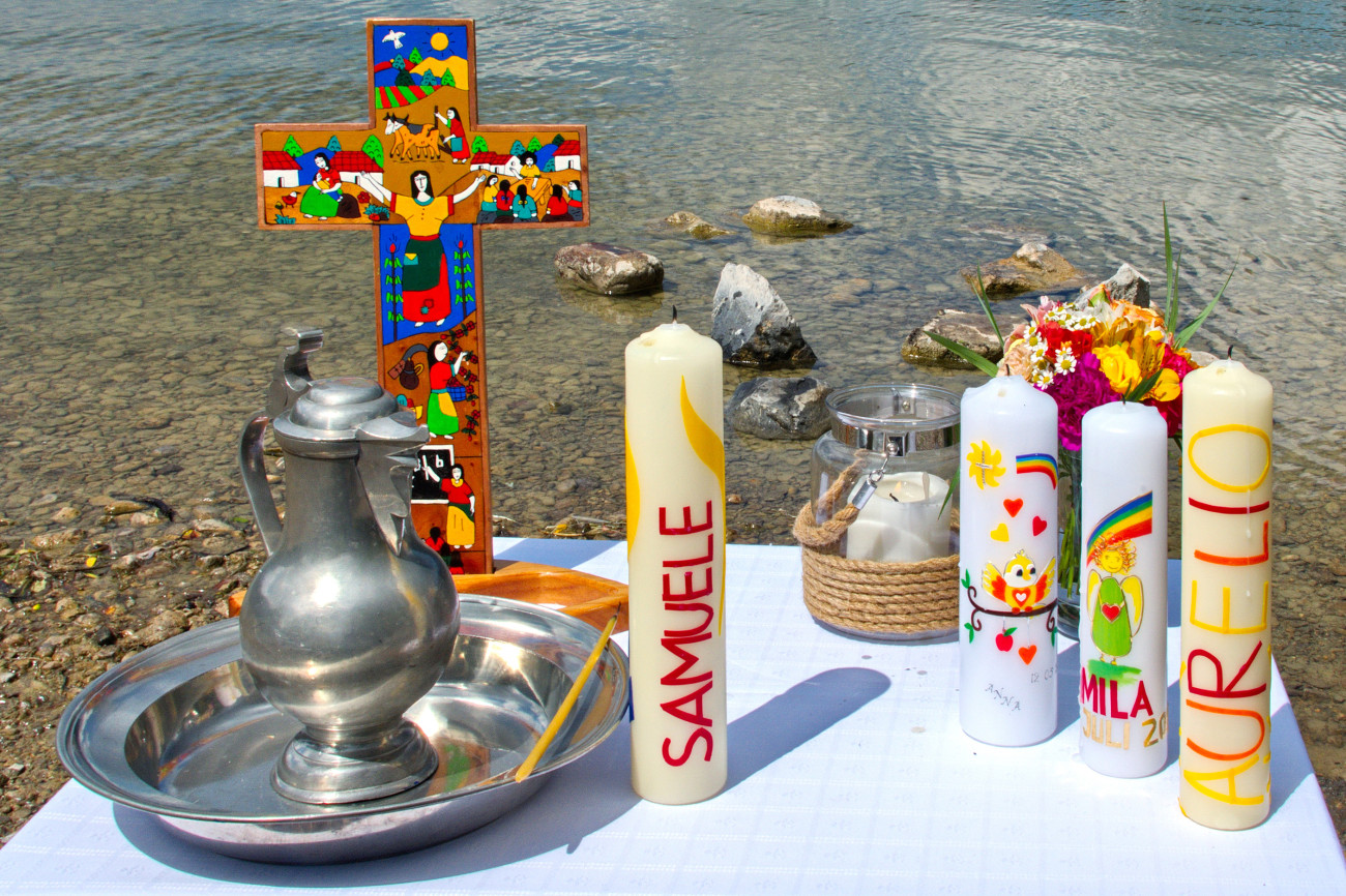 Am Taufbecken in der Friedenskirche oder im Innenhof feiern wir meist unsere Taufgottesdienste. Heuer werden wir zum ersten Mal auch am Ufer des Eichenauer Sees feiern: