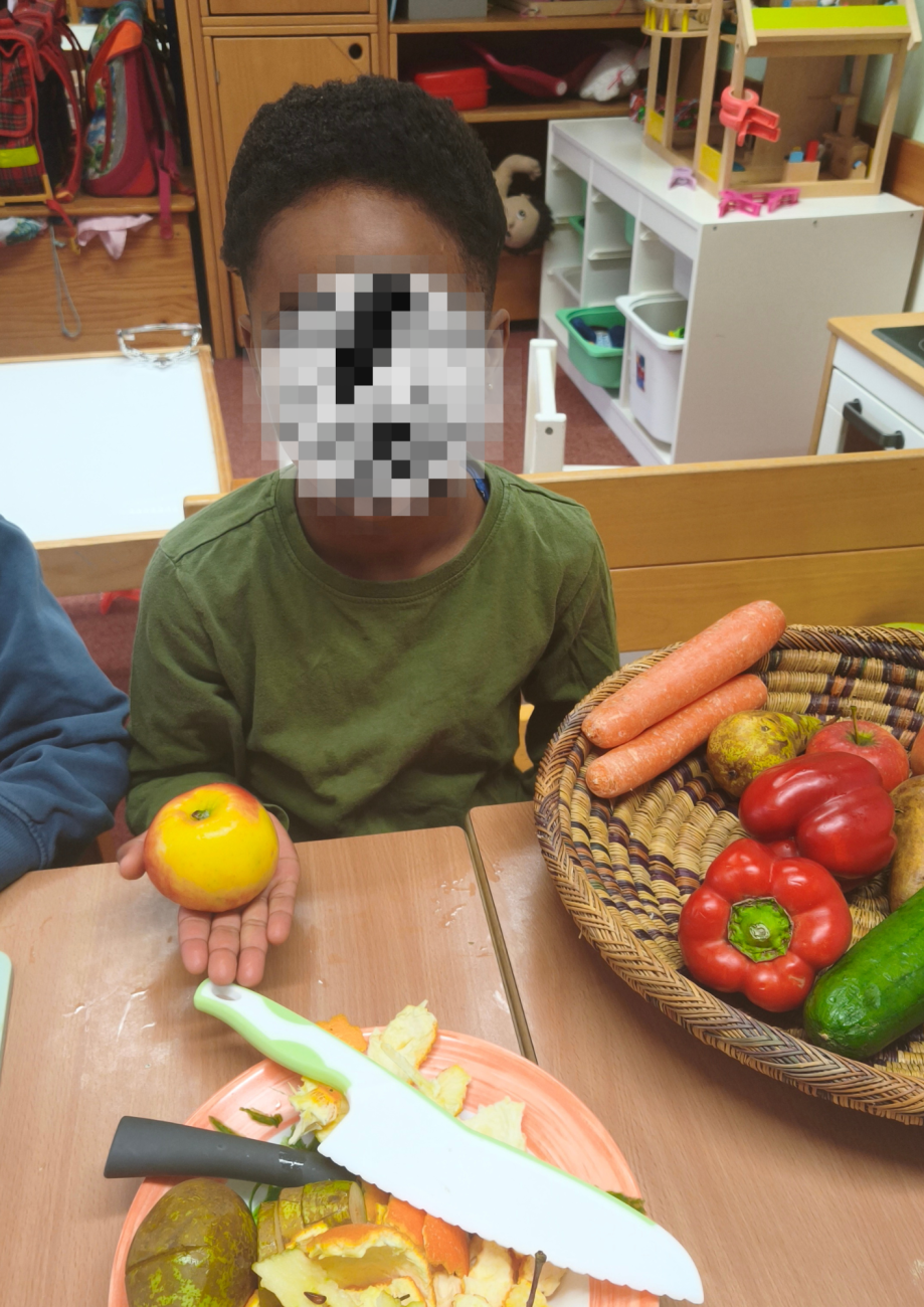 Zu Beginn besprechen wir gemeinsam, welche Lebensmittel wir für unser Frühstück benötigen. Anschließend dürfen die Kinder aktiv mithelfen. Einige Kinder waschen das Obst gründlich, andere schälen und schneiden es mit kindgerechten Messern in kleine Stücke. Dabei lernen sie den sicheren Umgang mit Küchenutensilien.