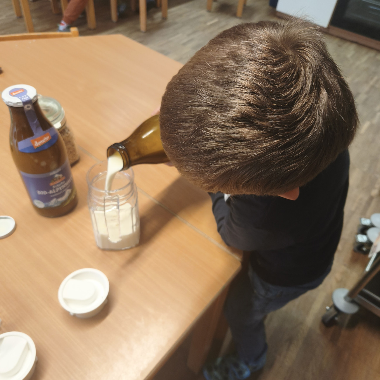 Außerdem helfen die Kinder dabei, Milch in eine Karaffe zu schütten, damit sie später leichter ausgeschenkt werden kann. Andere Kinder schneiden Käse in kleine Stücke und teilen die Butter in kleine Portionen.