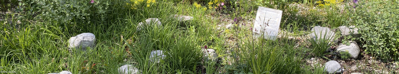 Vielleicht sind in diesem berühmten Wort der Bergpredigt nicht einfach „schöne, wilde Blumen“ gemeint. Deswegen haben wir unter anderem auch die Römische Kamille, Türkenmohn, Astern, Dipdam, Wildtulpen, Krokus und Leinkraut, (lat. Linaria dazu gepflanzt. Der Kies soll an den Wüstenboden erinnern, in dem sich die Pflanzen Palästinas mühsam behaupten.